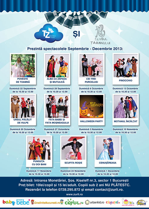 A venit toamna, începe ?i scoala ?i revine Teatrul Zurli, teatru pentru copii! Cu spectacole la fel de vesele ?i antrenante, costume colorate, personaje jucau?e, muzic? pe gustul copiilor ?i mult? voie bun?!